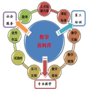建设“教培一体,开放共享”的数字化、网络化专业教学资源库,依托职教中心,面向学校、企业和社会开放,实现专业教学、员工培训和社会服务三大服务功能,实现共建共享。教学资源库见图: