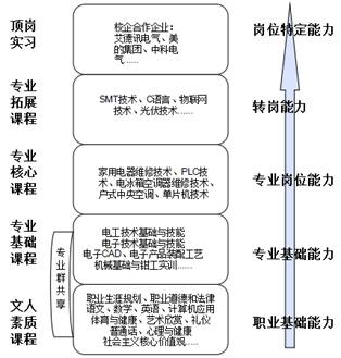 深入合作企业,分析与归纳企业典型工作岗位的职业活动和能力素质要求,对接国家职业标准,完善专业人才培养方案,构建“基础通用、能力主线、多层共享”的专业课程体系。如图: