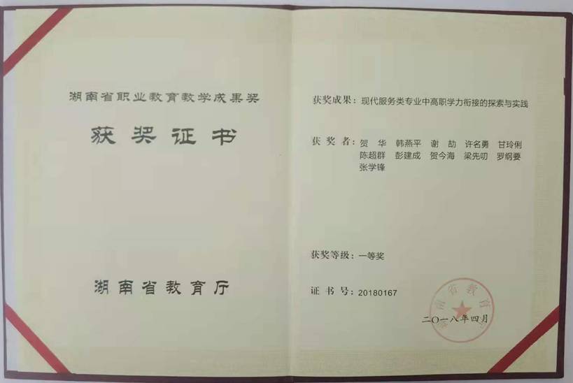 《现代服务类专业中高职学力衔接的探索与实践》项目,省级教学成果一等奖 |