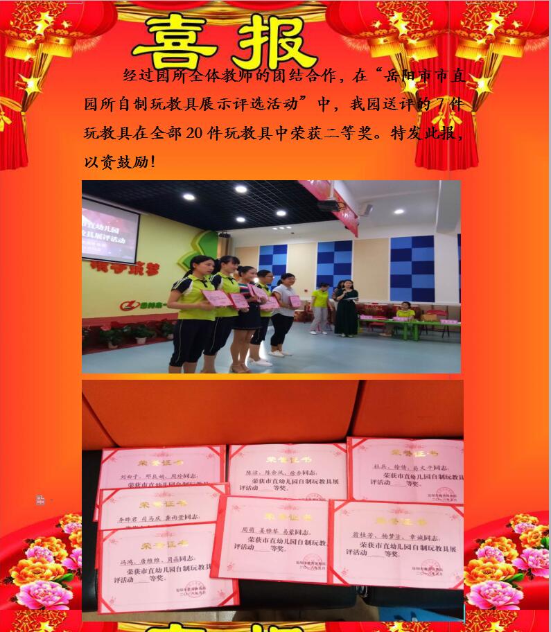 经过园所全体教师的团结合作,在“岳阳市市直园所自制玩教具展示评选活动”中,我园送评的7件玩教具在全部20件玩教具中荣获二等奖。