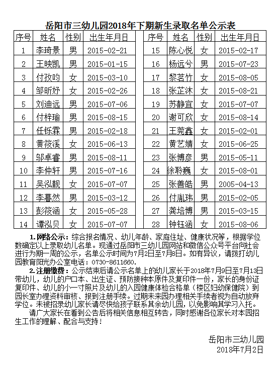 岳阳市三幼儿园2018年下期新生录取名单公示表