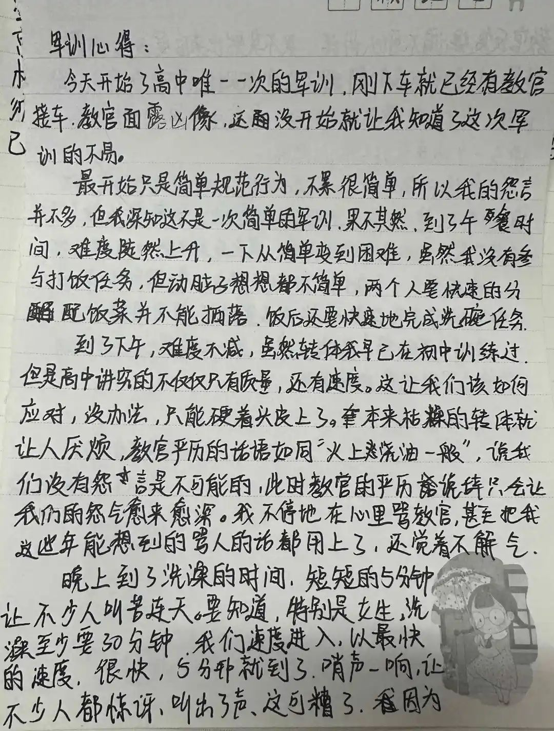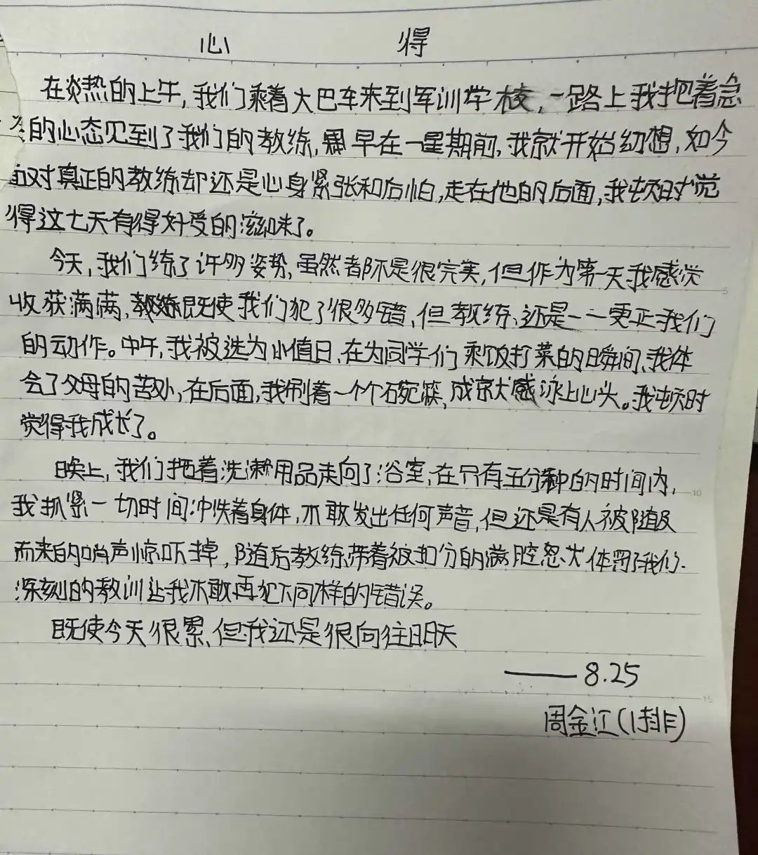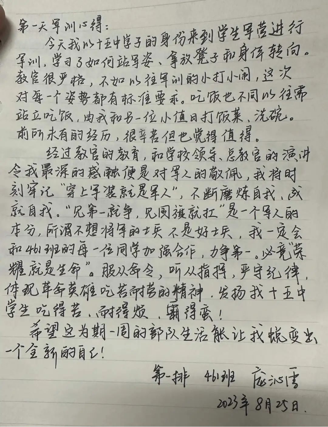465班潘天喆同学在心得中写到:“无论是中、晚的就餐,还是洗澡等环节,都让我感受到了在军营生活必须拥有的组织性与纪律性。军训的环境的确艰苦,但它也是对我们的磨炼。因此在面对艰苦的训练时,我们更要遵守严明的纪律,服从教官的命令,踔厉奋发,踏上青春新征程。”