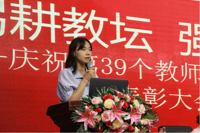 黄迎辉老师作为优秀教师代表发言。她从如何成为一名优秀教师、如何开展优秀的课堂、如何做优秀的榜样出发,鼓励每一位教师不断学习,超越自我。