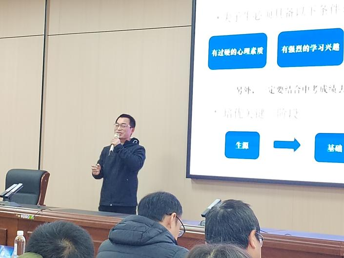 临川一中“最牛班主任”梅国福老师带来了讲座——《桃李不言,下自成蹊》。梅老师首先指出,做老师与其他职业是相同的,都需要找到自己的职业认同感和幸福感,他将这种认同感分为四个层面,一是业绩认可,二是内心认可,三是环境认可,四是物质认可。用鼓励表扬调动学生的积极性来促进学生成绩的提升,从而获得业绩认可。用积极乐观的心态感染自己、影响学生,成为一个喜欢教书育人的教师,从而获得内心认可。在教书育人的过程中,做到关心自己的健康与拓宽职业深度双管齐下,从而获得环境认可。接着,他总结了自己的班级管理策略,班主任要树立务实而长远的教育理念,制定民主化专制的班规并一视同仁地严格执行。最后,他强调了班级文化建设的重要性,并分享了“聚是一团火,散作满天星”“闪亮自我、温暖彼此、照亮他人”“悦己、悦人”的班级文化标语。立德树人,贵在日常。梅老师最后总结,班主任要努力做到严字当头,勤是途径。