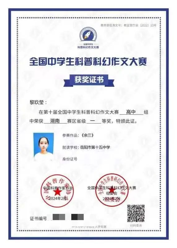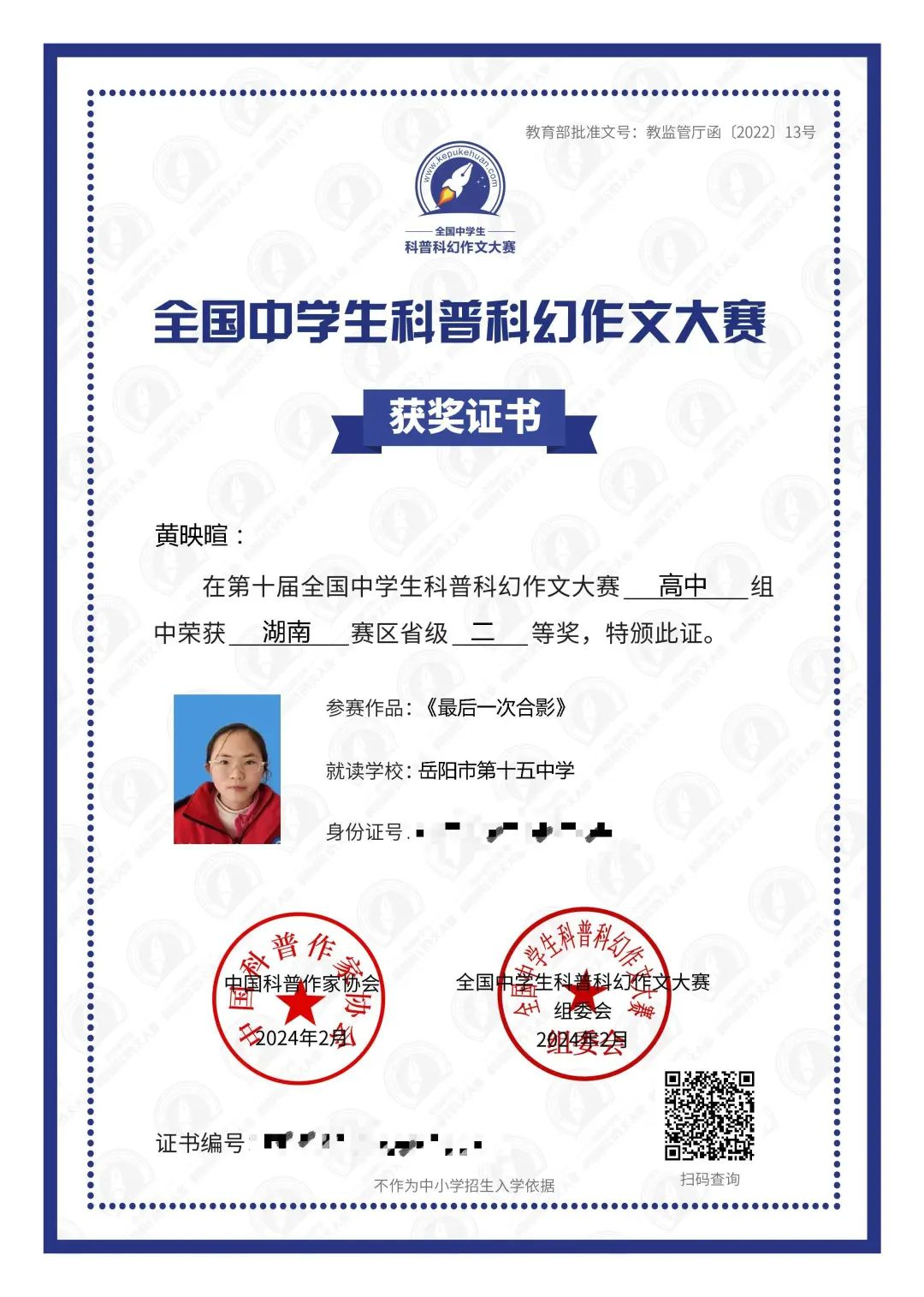 470班黎玖莹同学和472班黄映暄同学在第十届全国中学生科普科幻作文大赛高中组中分别荣获湖南赛区省级一等奖和二等奖!