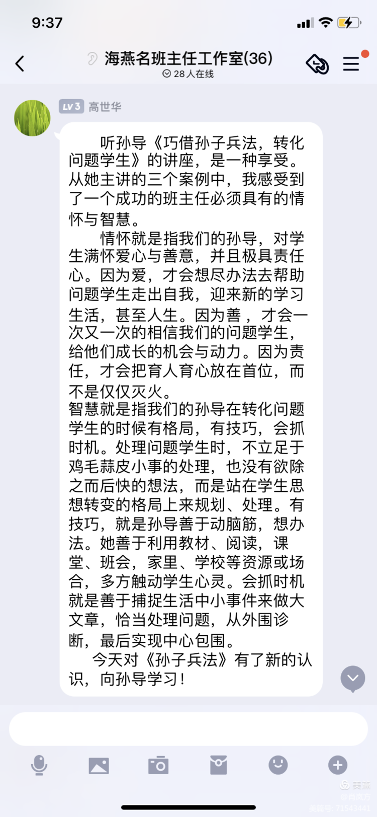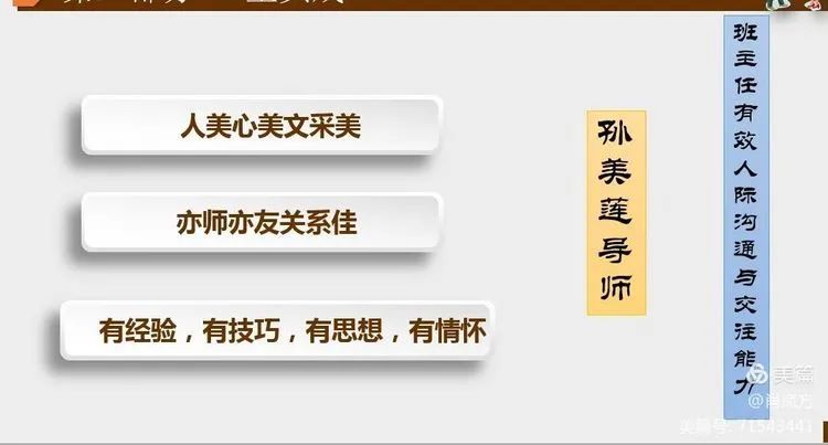 儒雅的声音娓娓道来,满满干货让年轻班主任醍醐灌顶!我们学到了与学生沟通:语言沟通的智慧(个别谈话也有集体交流),书信沟通,课堂交流,背后表扬,家长侧面沟通,其他学生交流等等!也充分利用各种渠道,各种方式,但归根到底还是攻心为上,挖掘学生身上向上的正能量!