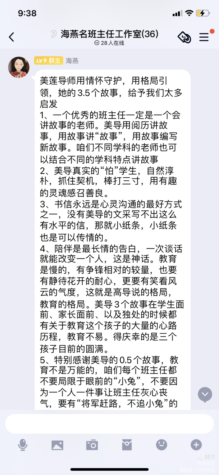 最后我们的名班主任工作室创始人:海燕导师,也就美导的分享,给我们年青班主任总结了几条关键做法:学会讲故事,用故事感染人,书信交流,陪伴!