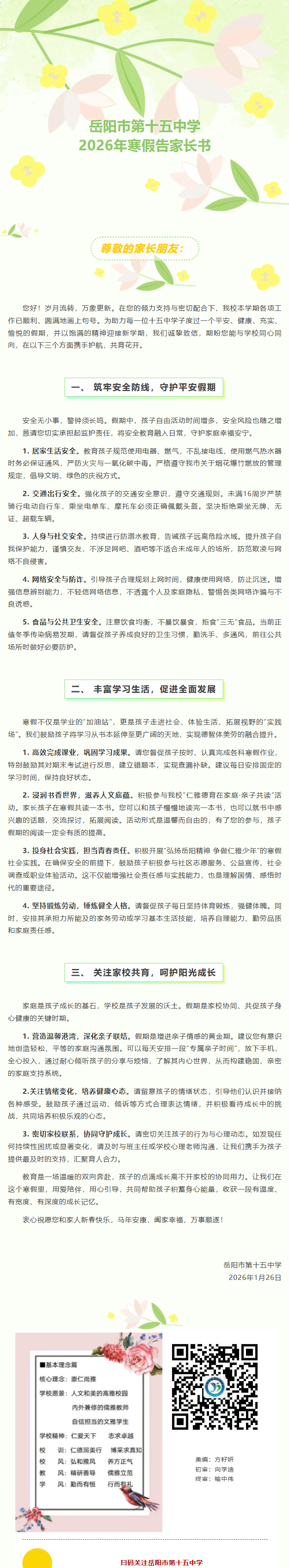 岳阳市第十五中学2026年寒假告家长书