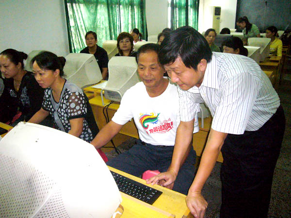 岳阳市残联党组书记、理事长侯定旺在就业培训课堂手把手指导残疾人操作电脑