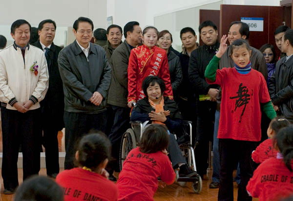 省残联和岳阳市负责同志欣赏正在残疾人服务中心排练的聋儿舞蹈《爱的呼唤》