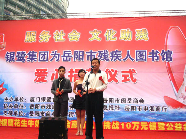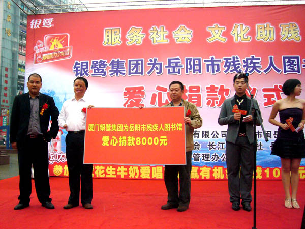 10月21日上午9时,在前日得知紧张筹备中的岳阳市残疾人图书馆急需大批图书的消息后,厦门银鹭食品集团有限公司率先行动,在岳阳市东茅岭商业步行街中心广场特别举行了“文化助残 爱心捐书”仪式,现场向岳阳市残疾人图书馆捐款8000元人民币,用于为贫困残疾人购置科普图书。岳阳市残联党组书记、理事长侯定旺高度肯定爱心企业的助残善举,并呼吁全社会都来关心残疾人的精神文化生活,让广大残疾人也能共享社会主义精神文明的成果。