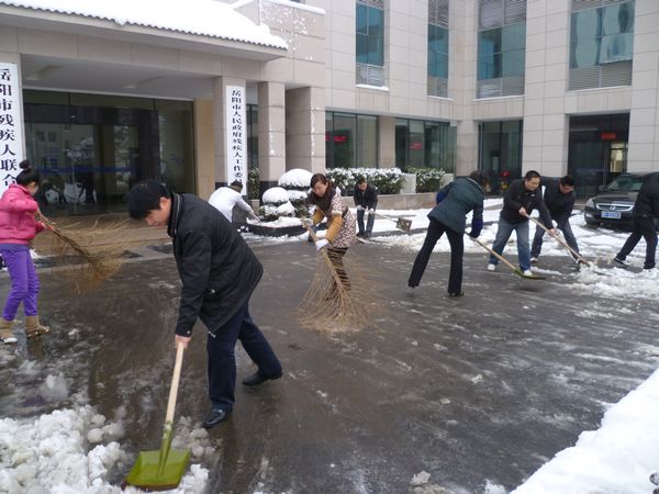 早在去年12月15日,市残联党组、理事会就召开专门会议,对“两节”、“两会”残疾人“特护期”的工作提前进行了细致周密的部署,其中“确保残疾人朋友在天气恶劣情况下也能够正常来访、办事”这一条列入了《市残联2011年一季度工作要点》加以强调。昨天,接到市委、市政府破冰扫雪的《通知》后,沈楠副理事长说:“由于残疾人朋友身体不便,糟糕的天气我们尤其要为他们考虑,千万不能让任何一个残疾人在他们的‘家门口’摔跤,否则,就是我们残疾人工作者的失职。”向科军副理事长则叮嘱一楼办事大厅的同志们:“最近大家就辛苦一点,对残疾人朋友迎来送往的时候不妨多递上一杯温暖的热茶,多说上一句:当心路上打滑,千万注意出行安全!”由于条件的限制,市残联配备的除雪工具铁锨和扫帚不够,20日清晨,有几个同志甚至将自己家里的铁锨和扫帚带到了机关里……顶着零下二、三度的严寒,尽管破冰除雪工作十分艰难,许多同志的手和脸都冻得通红,然而,这一切丝毫没有影响残联同志们的除雪热情和工作效率,大家干劲十足的扫雪身影也深深感染了路人,他们纷纷投来了赞许的目光。