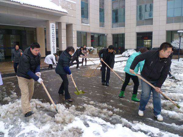 1月20日清晨,在凛冽的寒风中,刚走进机关大院的市残联副理事长沈楠和向科军立即带领全体干部职工热火朝天地破冰扫雪。一个多小时过去了,岳阳残疾人服务中心内外厚达7、8厘米的积雪不见了踪影,进出办事的残疾人朋友露出了欣喜的笑容。