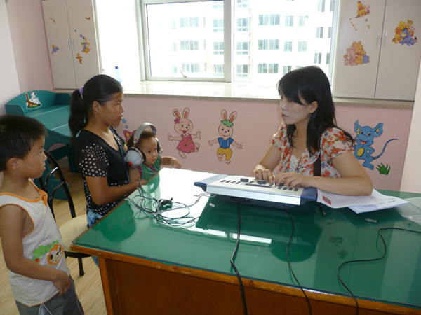 图为验配专家为前来参加筛查的聋儿进行听力测试