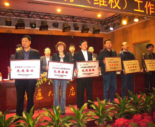 侯定旺理事长(左三)代表岳阳市残联登台接受“全省残疾人信访(维权)工作先进集体”荣誉奖牌