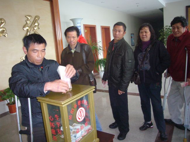 拄着双拐的宋亚洲和黄金辉代表岳阳市自立汽车服务有限公司13名残疾人朋友慷慨捐款1000元。他们说:“这些天,我们心情特别沉重。过去,我们得到了党和政府的许多恩惠。现在,国家有难,我们不出一点力,心里不安!”