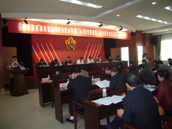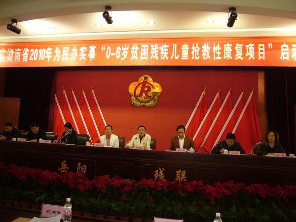 为贯彻落实湖南省政府2010年为民办实事项目,4月27日上午,岳阳市残联举行隆重仪式,正式启动了“0―6岁贫困残疾儿童抢救性康复项目”。岳阳市政府实事办,市财政局、市民政局、市统计局、市卫生局负责人,各县市区残联理事长、分管副理事长和项目定点康复机构负责人出席仪式。