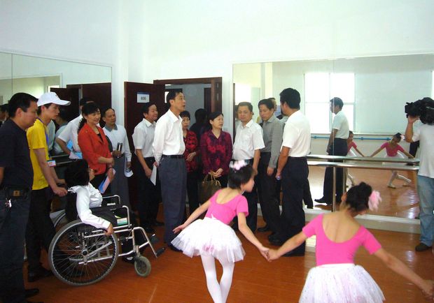 在歌舞排练厅,人大领导欣喜地观看残疾人演员排练节目