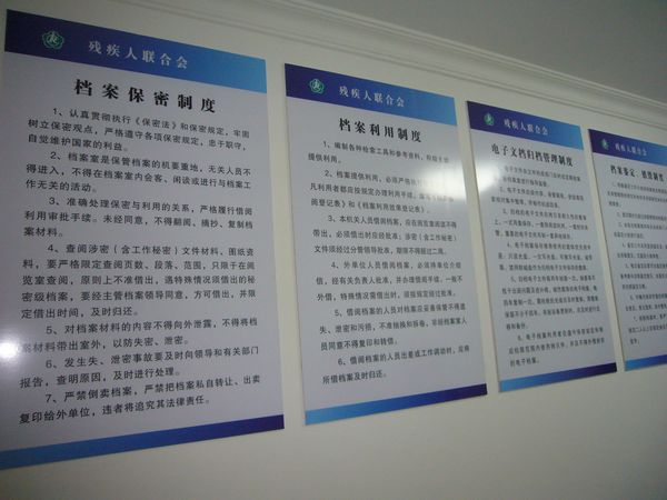 长期以来,岳阳市残联党组、理事会高度重视档案工作,始终将档案工作摆在重要位置,成立了以理事长为组长的档案工作领导小组,特别是在争创档案工作规范化管理省二级活动开展以来,从组织管理、保管保护设施设备、经费保障等方面给予了全方位支持,集中全会力量开展档案基础业务工作,为创建工作打下了坚实基础;坚持了档案集中统一管理,档案工作管理网络和档案管理制度健全,职责明确。残联机关档案专业用房充足,档案专用设备较为齐全,档案库房“九防”措施得力有效,能够确保档案的安全。同时,市残联严把文件收集关,确保了各类文件材料比较完整、齐全、准确、及时地收集归档。特别是结合“一切为了残疾人”业务工作的民生档案管理程式,将原来分散保管的涉残档案进行集中和规范整理,成效明显。档案分类科学、排列有序、编目编号系统规范。机关档案门类、载体齐全,内容丰富,能够较为准确地反映残联机关基本历史面貌和工作职能。2009年通过使用档案专业管理软件,将残联档案目录全部录入微机,基本实现了目录机检查询,提高了档案信息服务能力和水平。