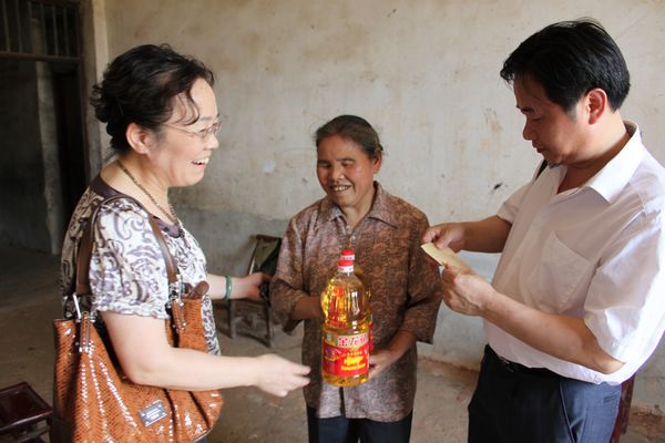 图为沈楠副理事长和巢向阳副调研员将爱心款物送到盲人黄嫦娥的手中