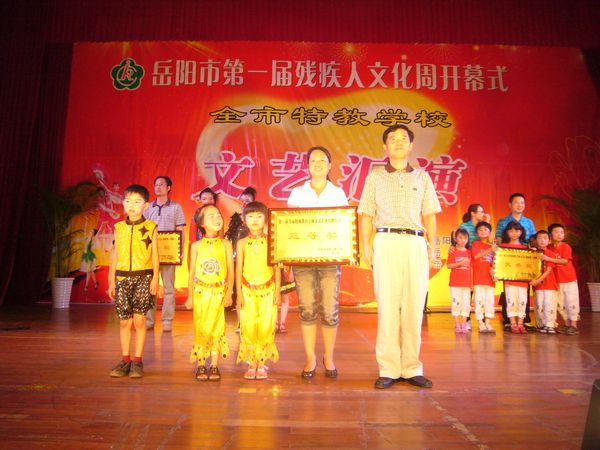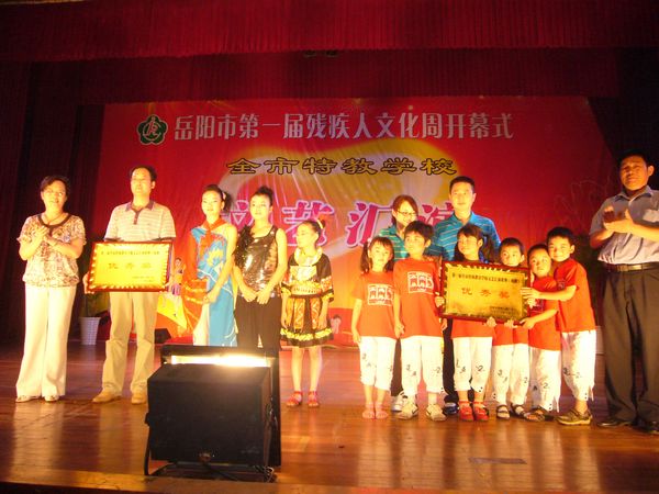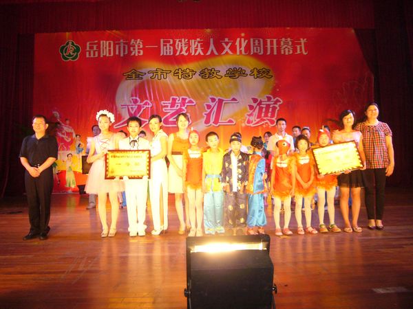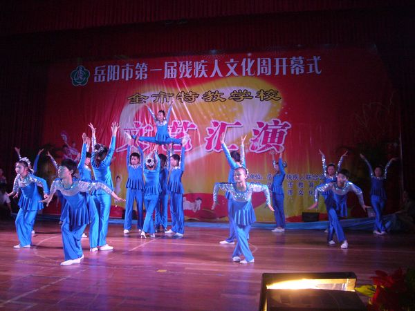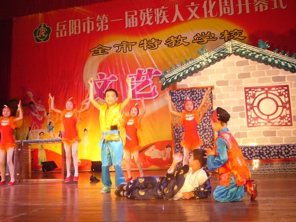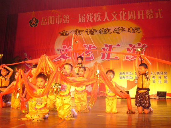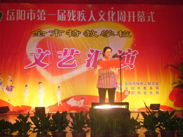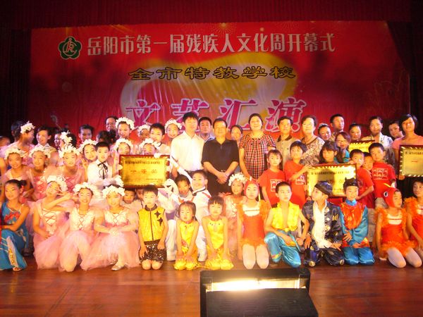 千里巴陵残疾英儿欢声笑语颂盛世,八百洞庭 艺苑新苗载歌载舞展风姿。6月20日上午,晓朝宾馆中心会堂,岳阳市第一届残疾人文化周活动在那里拉开序幕。本届残疾人文化周活动是岳阳市残联精心策划、组织开展的一项大型残疾人文化艺术系列活动,本届文化周活动的主题是:欢庆建党90周年,胸怀文化梦想奋发向前。即日起,岳阳市残联将在为期一周的时间里,连续举办“全市第一届特教学校文艺汇演”、“残疾人书法、绘画、摄影、手工艺品展览”、“‘文化进社区’基层残疾人文化座谈会”、为“岳阳市残疾人文艺沙龙”和“全国特殊艺术人才培养基地”揭牌、举办“党的阳光照我心”主题征文和“我与祖国共成长”演讲比赛等一系列旨在歌颂党的英明领导,弘扬时代文明新风,活跃基层残疾人文化生活,动员引导广大残疾人走出家门,积极参与公共文娱生活,促进残健融合、扶助广大残疾人共享社会主义经济、文化大发展大繁荣成果的文化艺术活动,相信在本届文化周活动的有力推动下,关系着35万残疾人精神文化生活的岳阳市残疾人文艺工作必将迎来一个新高潮、开创一个新局面。
