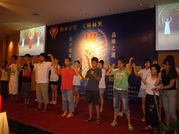 图为在爱心助学慈善交接仪式上,10名贫困残疾学子表演《感恩的心》以表达对社会爱心的感激之情