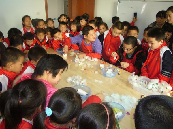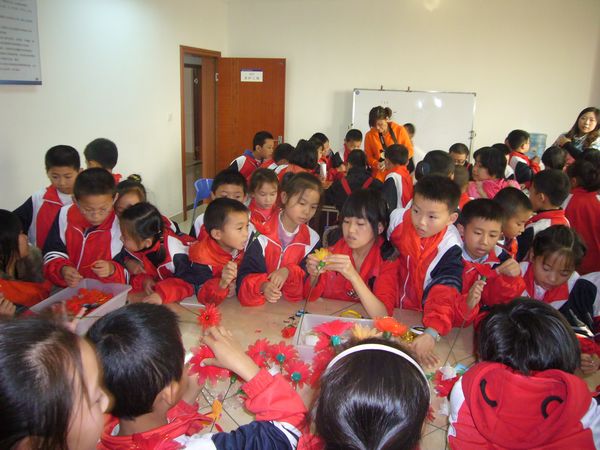 图为东城小学的孩子们走进康馨益智院观看残疾学员制作丝网花