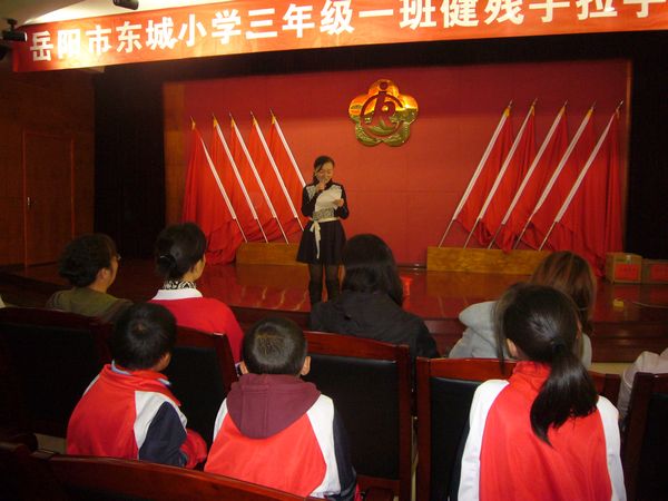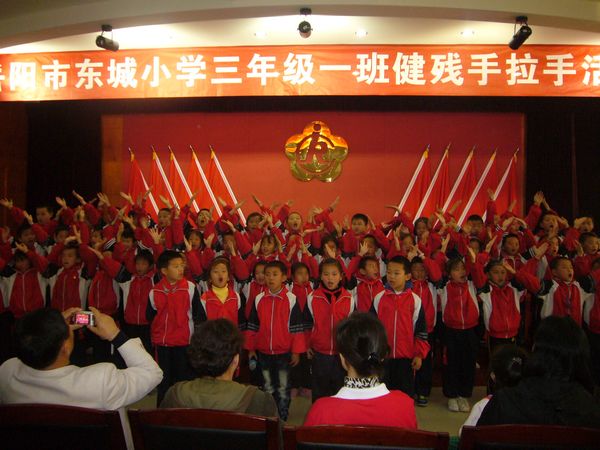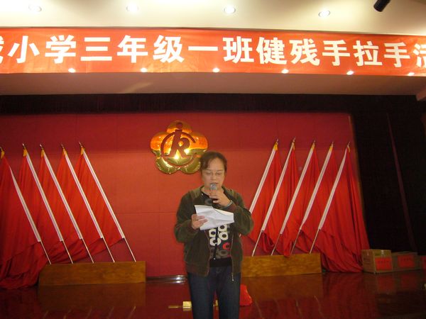 2点20分,在中心六楼多功能报告厅举行了文娱节目表演和助残捐赠活动,95名小朋友和30多位老师家长参加。市残联党组成员、副理事长沈楠出席活动并讲话,她对东城小学三年级一班这次发起的“健残手拉手”活动,对老师、家长和孩子们的爱心义举给予了充分肯定。特别是听到孩子们主动将自己部分旧的用品和玩具拿到校园进行义卖,用所得的收入来为残障儿童奉献爱心时,她紧紧地拉着刘灿老师的手表示感谢。她希望,这次开展“手拉手”活动,成为一座桥梁、一条纽带、一个导向,能够拉起家长的“手”,能够拉起社会的“手”,能够倡导更多的社会爱心力量关爱残疾人特别是残疾儿童,从而使全市健残小朋友的手越拉越紧,心越贴越近。