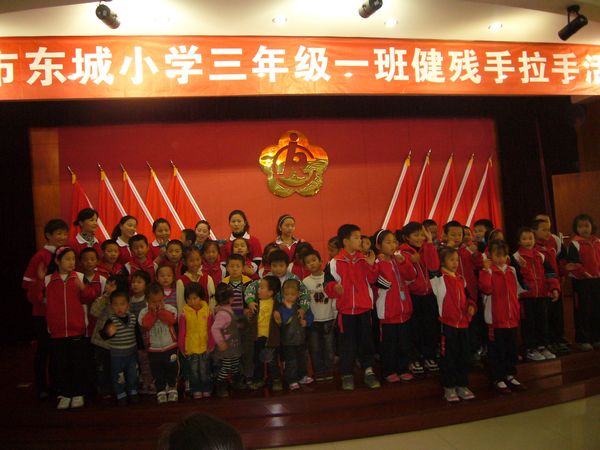 随后健残小朋友一起互动表演节目,三一班小朋友有感情地朗诵了《我骄傲,我是中国人》,李天天、李佳敏、刘欣蕊、张瑾等小朋友还特意为残障小朋友们带去了精心准备的舞蹈《荷塘月色》、《中华美德》、《我不上你的当》、《你最牛》等。自闭症训练中心的小朋友和家长表演了《有你的地方是天堂》,聋儿语训部黎景小朋友朗诵了《春晓》等两首古诗,高金凤小朋友在手语老师的指挥下,表演了《儿歌》,残障儿童的表演打动着每一位在场老师、家长和小朋友的心,许多家长和小朋友都流下感动的泪。精彩的演出掀起了阵阵浪潮,孩子们跟着旋律挥舞着双手,脸上洋溢着欢乐、纯真的笑容。文娱演出在全场合唱《感恩的心》的旋律中结束。最后,东城小学的孩子向结对的小朋友们赠送了礼品,残障小朋友们捧着自己喜爱的玩具和食品喜笑颜开。下午4点,活动圆满结束,健残小朋友们依依惜别。