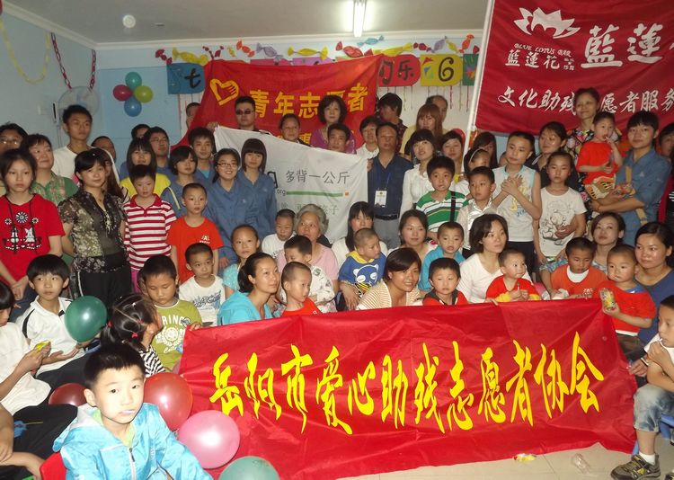 岳阳市爱心助残志愿者协会、湖南省多背一公斤志愿者协会岳阳分会、巴陵石化己内酰胺事业部青年志愿者协会和蓝莲花助残志愿者服务队等爱心人士与残疾孩子们合影留念