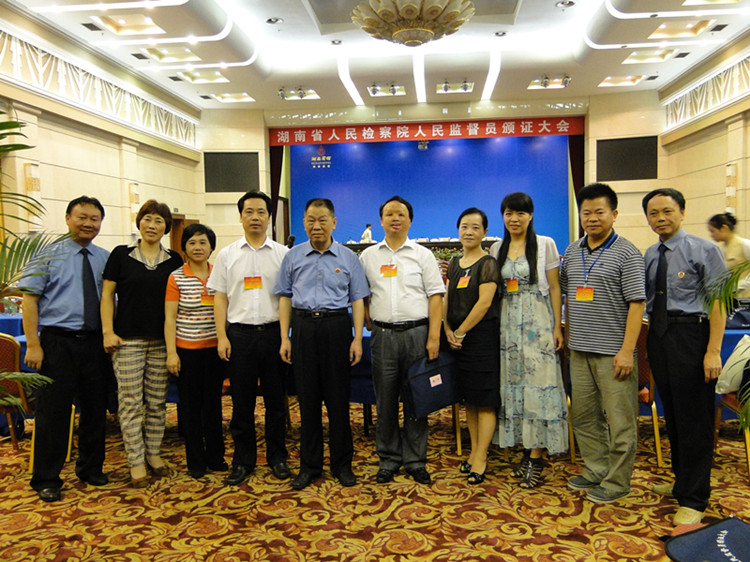 图为湖南省人民检察院检察长龚佳禾热烈祝贺新当选的岳阳市七名人民监督员并合影留念