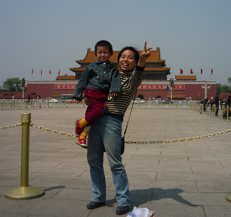 刚刚做完耳蜗手术后,母亲张朝晖和杨雨盟在天安门广场庆祝“胜利”!