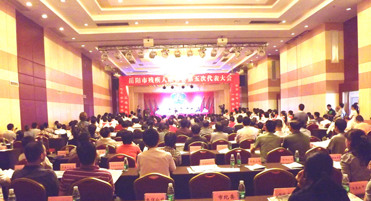 平等参与共享,人道弘扬,一路凯歌迎盛会;代表服务管理,事业争先,三通鼙鼓壮新征。9月27日,岳阳华瑞丹枫建国饭店内外张灯结彩,喜气洋洋。岳阳市残联第五次代表大会在这里隆重召开。省残联理事长肖红林,市委副书记李志坚,市政协主席赖社光,市委秘书长樊进军,市人大常委会副主任易丽珍,市政府副市长宋爱华和市政协副主席张振彬等省市领导出席大会。宋爱华副市长主持大会。省残联办公室主任侯定旺和组织人事部部长赵晨洁,市委副秘书长曹合群,市政府副秘书长廖长生,市民政局局长刘树平,共青团岳阳市委书记白再兴,《湖南日报》岳阳记者站站长徐亚平,和120名大会正式代表、58名特邀代表及52名列席代表参加大会。