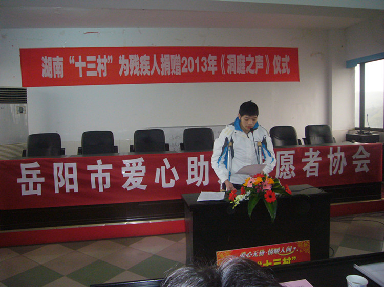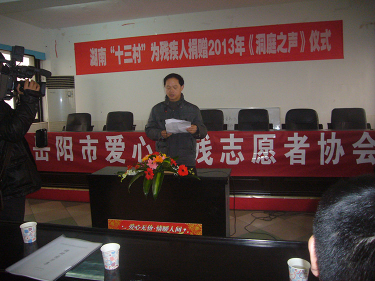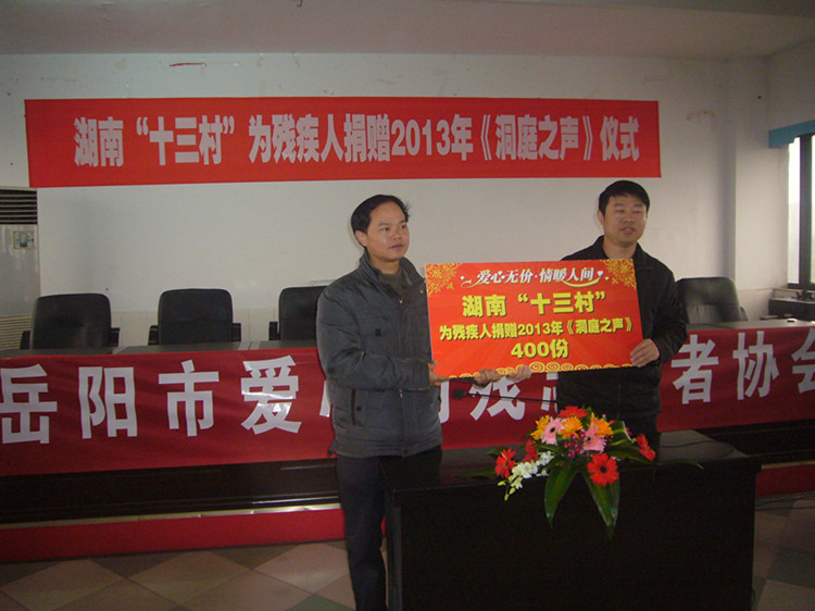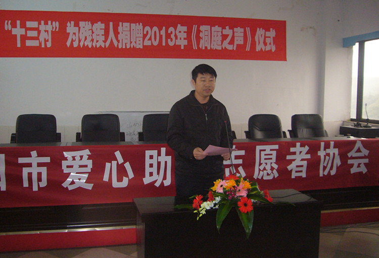 仪式上,向科军理事长代表岳阳市残联发表讲话。他说,今年9月14日,湖南省十三村食品有限公司在岳阳残疾人服务中心举行了隆重的扶残助学捐款仪式。当时,李国武先生亲临现场为我市20名贫困残疾学生和残疾人家庭子女捐款2万元,帮助他们完成学业,受助学子和残疾人工作者对十三村公司和李国武先生心存感激、十分感动。今天,李国武先生又在这里捐款赠送《洞庭之声》报给中心城区的300名残疾人朋友,让这些因身体残疾出行困难的残疾人朋友,能够足不出户便了解新闻事件、学习利国惠民的好政策,让这些渴望学习、渴望融入主流社会的残疾人朋友从此又多了一份精神食粮。在此,我谨代表岳阳市残联党组、理事会,衷心感谢李国武先生和十三村公司为残疾人事业发展作出的积极贡献。