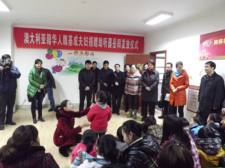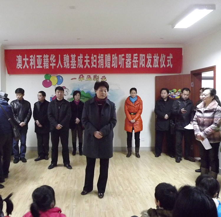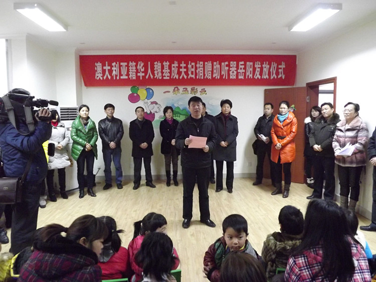 向科军理事长首先致词。他代表岳阳市残联真诚感谢宋爱华副市长和市政府外事侨务办爱心人士为残疾孩子献爱心、送温暖。他说,宋市长带领外事侨务办的各位领导专程到残疾人服务中心,代表澳籍华人魏基成夫妇为正在这里接受康复训练的听力言语残疾儿童捐赠50套助听器,这不仅体现了外事侨务办主动拓展工作范围,敬业奉献的优良工作作风,更彰显了外事侨务办的同志们扶危济困、爱心助残的高尚品德。