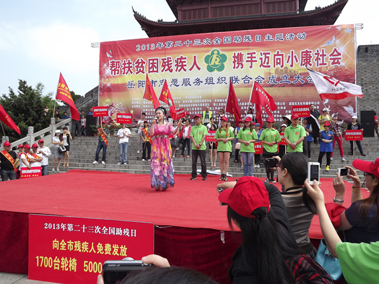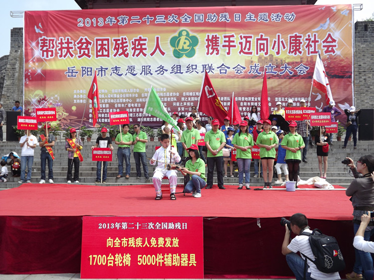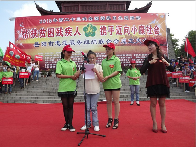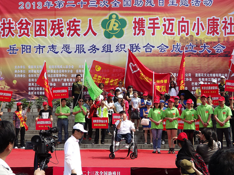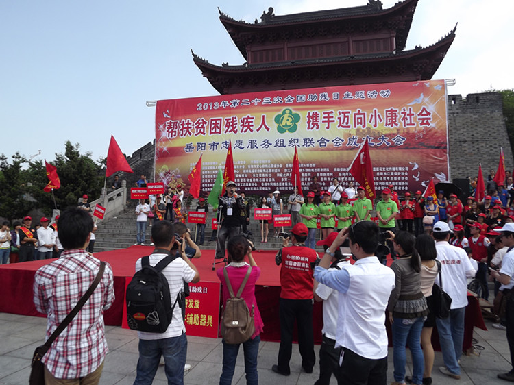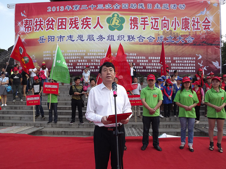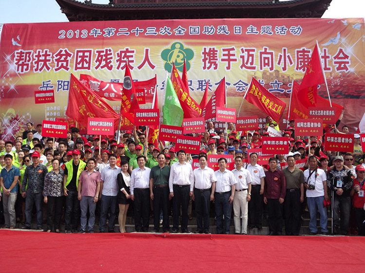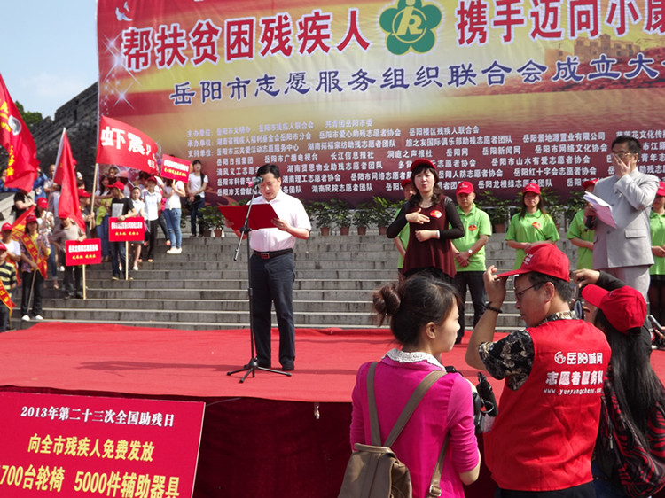 爱心融融,忧乐相系,同创和谐歌盛世;彩旗飘飘,残健携手,共赴小康续前程。5月17日上午9时,岳阳市巴陵广场,雄伟壮丽的瞻岳门下,由岳阳市文明办、岳阳市残联和共青团岳阳市委主办,湖南省残疾人福利基金会岳阳市分会、岳阳市爱心助残志愿者协会和岳阳楼区残联承办的“帮扶贫困残疾人,携手迈向小康社会”岳阳市第23次全国助残日主题活动暨岳阳市志愿服务组织联合会成立大会隆重举行。现场融合了“爱心捐款”、“志愿者服务” 和“助残日宣传”三项内容,交叉有序进行。中共岳阳市委常委、市委宣传部长徐新启出席活动并发表重要讲话。岳阳市人大常委会副主任余炳锐,岳阳市人民政府副市长熊炜,市政协副主席黎四清,市委宣传部副部长、市文明办主任许卫国,共青团岳阳市委副书记李乐,市民政局副局长杨书生,岳阳市残联副理事长沈楠、李正望,市残联调研员陶深根,湖南省残疾人福利基金会岳阳市分会副理事长巢向阳等出席活动。爱心人士湖南拓福家纺有限公司总经理危李先生,爱心企业岳阳旅之友国际俱乐部代表游莉女士也出席活动。来自全市12个县市区的130多位残疾人代表,湖南日报、湖南红网、岳阳日报、岳阳市广播电视台,长江信息报、洞庭之声报、岳阳网和岳阳新闻网等11家新闻媒体,还有来自全市39个爱心助残志愿者协会和组织的320多位志愿者代表也积极参加了现场活动。