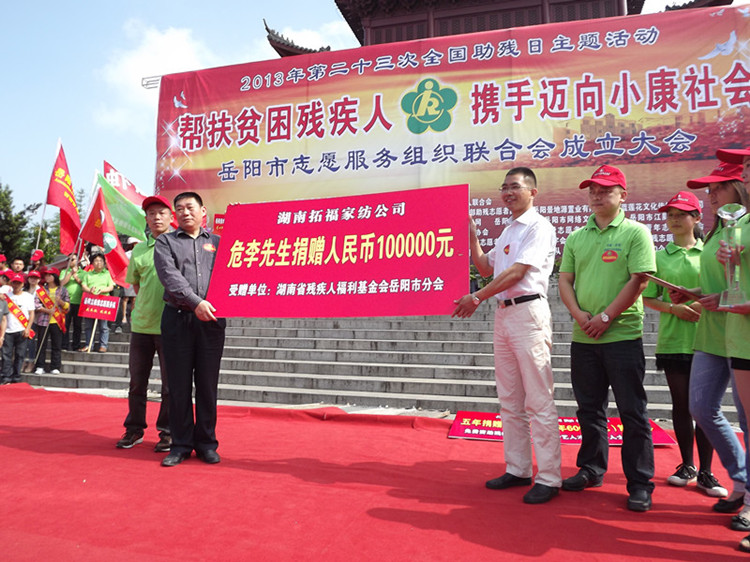 岳阳市政协委员、湖南省拓福家纺有限公司总经理危李先生向省残疾人福利基金会岳阳市分会捐款10万元