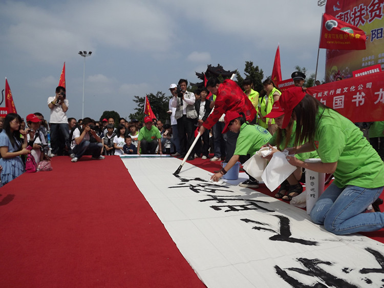 肢残人书法家胡扬帆用自制的“大狼毫”现场书写“爱心助残,功德无量”