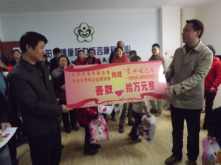 临别之际,团市委书记白再兴将“爱心暖巴陵”――岳阳市关爱弱势青少年群体捐赠拍卖活动筹集的10万元善款转交给市残联理事长向科军。白再兴书记表示,今后,团市委将联合市青联、市青年企业家协会一道,持续帮助我市贫困脑瘫、智障、听障、自闭症残疾儿童开展抢救性康复行动,扶持这些困境家庭中的残疾儿童得到科学有效的康复训练,早日摆脱生活困境,实现幸福小康生活。