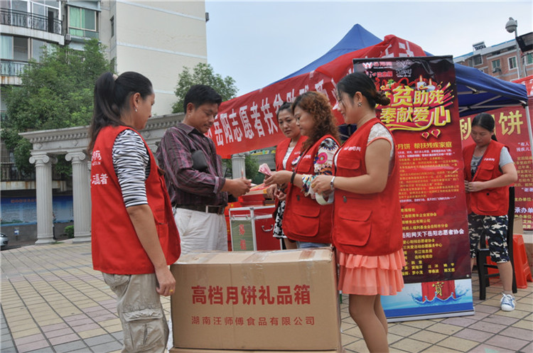 近几年来,长江信息报记者韩章始终不遗余力为残疾人朋友呼唤社会爱心。中秋节前夕,韩章同志就开始策划开展一场爱心义卖活动,用义卖所得资助贫困残疾人家庭。这个爱心助残活动的计划一经提出,得到了岳阳市残疾人联合会党组书记、理事长向科军的赞同与支持。湖南汪师傅食品有限公司总经理汪洋先生获悉此事后当即表态,免费提供该公司生产的月饼参与助残义卖活动。岳阳网天下岳阳志愿者负责人李勇、李青松、罗小龙等人也积极响应,立即召集志愿者具体承办义卖活动的所有事项。但事情没有想象的那么顺利,在城区繁华地带开展义卖活动的申请并未获得城管部门的批准,李青松、李杨波、陈文忠等志愿者又紧急联系了湖畔小区、洞氮社区、锦绣河山小区坚持开展义卖活动。9月4日、5日,志愿者徐长福、李杨波驾车从汪师傅公司装运义卖月饼送至3个义卖点。“你们辛苦了,我代表广大残疾人朋友真诚感谢你们,你们是我们大家学习的好榜样!”5日下午,向科军理事长现场慰问义卖活动志愿者时高度评价此次公益活动,并勉励志愿者们在文明城市创建工作中做出新的更大贡献。6日晚上8点多,汪洋先生看到志愿者们还坚守在义卖岗位,高兴地竖起了大拇指,连声说:“爱心助残,我们共同努力吧!”