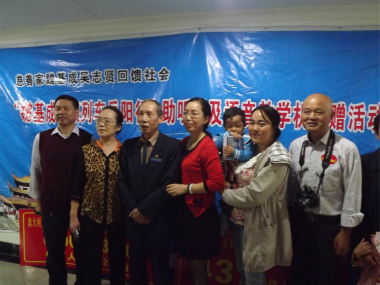 传递爱心天籁,情暖岳阳聋残。10月18日上午8点半,岳阳市残联四楼博康语训中心门口赫然树立着两块爱心捐赠牌:“澳大利亚天籁列车创办人魏基成伉俪向岳阳市捐赠助听器6000只,儿童棉衣3200套,价值1232万元”、 “台湾元勋国际董事长吴志贤伉俪向岳阳市捐赠聋儿语音教学机43台,价值86万元”,继9月26日在湖南理工学院举办的“天籁列车岳阳行”助听器捐赠活动后,慈善家魏基成夫妇、吴志贤夫妇再次到岳阳为听力语言残疾人奉献爱心。此次助听器及语音教学机捐赠活动,由岳阳市政府残疾人工作委员会和湖南省残疾人福利基金会岳阳市分会主办,魏基成夫妇“天籁列车项目”代表吴志贤、黄兆邦及三名义务验配师,岳阳市残联理事长向科军、副理事长沈楠,岳阳楼区、岳阳县、临湘市残联代表等出席活动。岳阳惠声语言康复中心、岳阳县特校、博康语训中心151名聋生代表参加活动,市爱心助残志愿者协会的志愿者们现场为大家提供服务。据悉,“魏基成天籁列车岳阳行”爱心团队,10月17日分别在汨罗和平江特校,为汨罗市、湘阴县、平江县特校229名听障人士适配助听器、适用教学机,10月19日还将赴华容县开展活动。