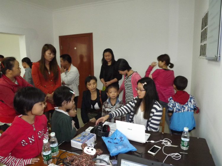 志愿者们为家长们逐个讲解助听器的使用方法