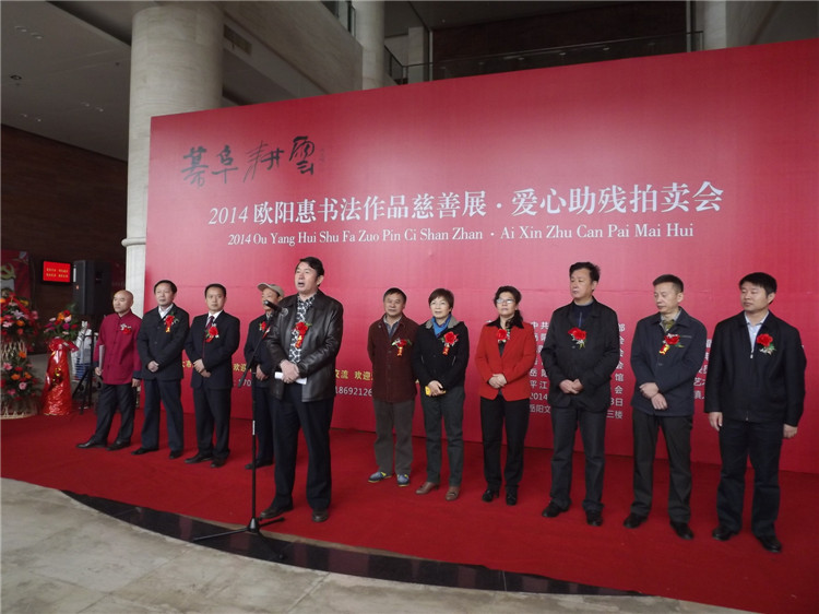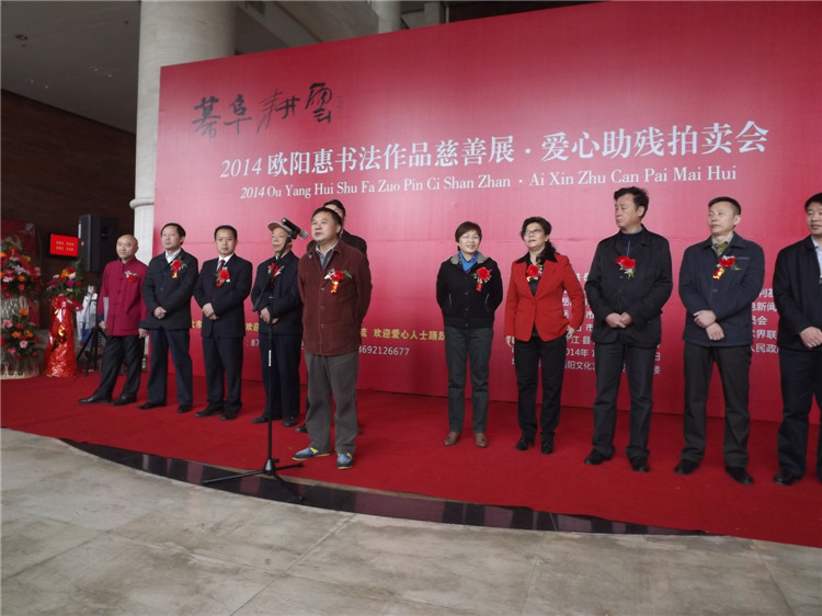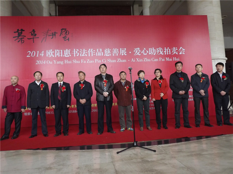 11月18日上午10时,岳阳文化艺术会展中心,“幕阜耕云・2014欧阳惠书法作品慈善展”隆重开幕。省文联名誉主席彭见明,市委常委、宣传部长徐新启,市人大副主任陈志莲,市政府副市长李为,市政协副主席刘晓英、罗陆平,湖南理工学院院长余三定,市文联主席周迅,市文广新局局长黄建文,市残联理事长向科军,省残疾人福利基金会岳阳市分会副理事长巢向阳,和省市书画艺术界专家、学者黄甲喜、黄国芳、王石生、李辉模、崔向军、戴剑等,和平江县政协、县文联等负责人及社会各界人士,岳阳市爱心助残志愿者等约500人参加开幕式。市委宣传部副部长彭东明主持开幕式。
