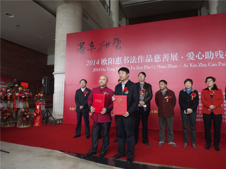 作为一位闻名省内外的实力派书法家,欧阳惠同志是我市最早加入中国书法家协会的会员之一,本次展览全面展示了他30多年来研习传统书法取得的艺术成就。尤为难能可贵的是,欧阳惠同志将本次展出的126幅精品中的66幅作品现场无偿捐赠给了省残疾人福利基金会岳阳市分会,用于帮助贫困残疾人。日前,欧阳惠同志已经和省残疾人福利基金会岳阳市分会签订协议,今后每年他都将为此项助残基金捐赠10幅以上佳作。他的爱心善举不仅呈现了一位自强模范、一位小有成就的书法家扶残助残的博爱情怀,更彰显了我市残疾人践行社会主义核心价值观、积极回报社会、乐于奉献社会的精神文明新成果。