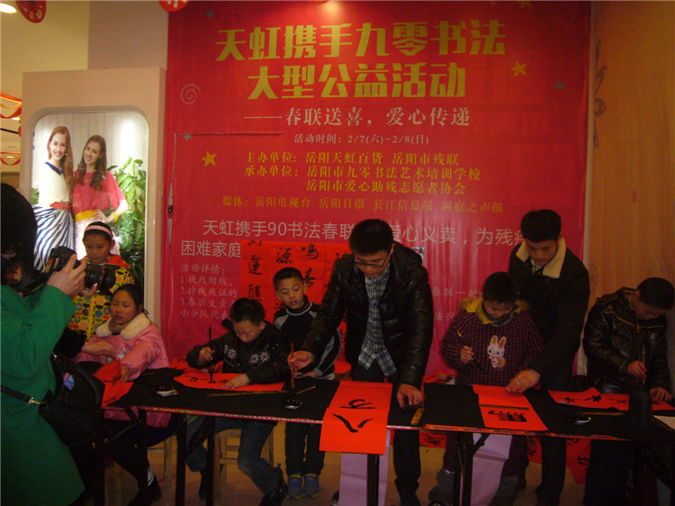 两个活动现场爱心涌动,一边是徐驰、欧阳惠和王石生等著名书法家洋洋洒洒挥毫泼墨,一边是九零后书法新秀李晗率领的青少年书法爱好者工整书写,在这寒冷的冬季,岳阳老中青书法家用他们火红而精美的春联,谱写了一曲爱心助残的大爱之歌。岳阳电视台台长孙山青说:“文化助残应该成为文明岳阳的一面鲜艳的慈善公益大旗!”据活动组织者“善行天下”栏目制片人侯奕安介绍,本次活动义卖善款3日之内将由省残疾人福利基金会岳阳市分会工作人员,全部送到渴望雪中送炭的残疾人家中去,资助他们过一个温暖祥和的春节。