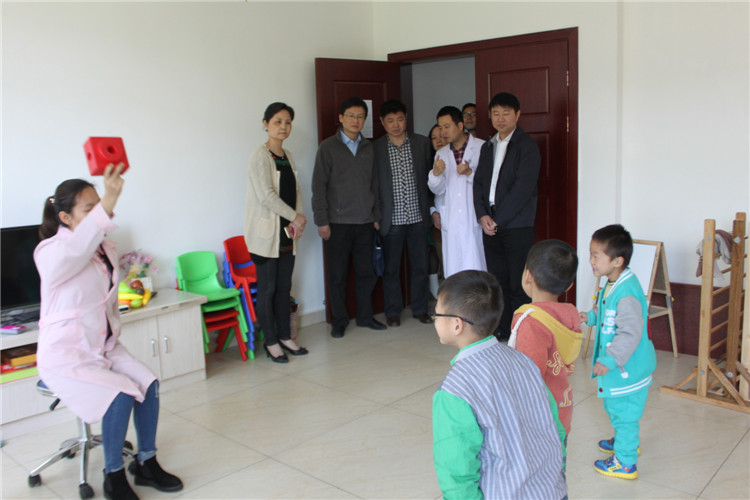 图为向科军理事长和王涛科长在洞氮医院察看脑瘫儿童康复训练情况