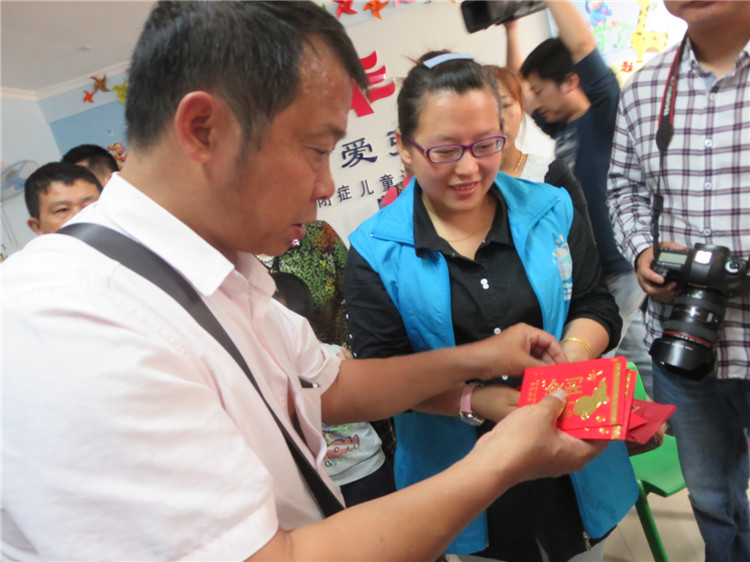 市聋人协会主席吴亚洲与爱弥尔训练中心负责人一起为孩子们发放爱心红包
