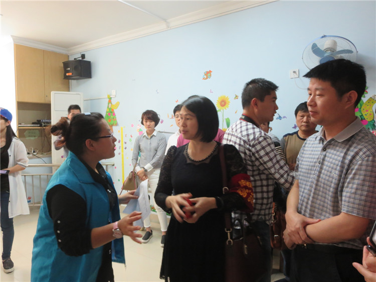 爱弥尔训练中心负责人向爱心人士介绍孩子们的康复训练情况