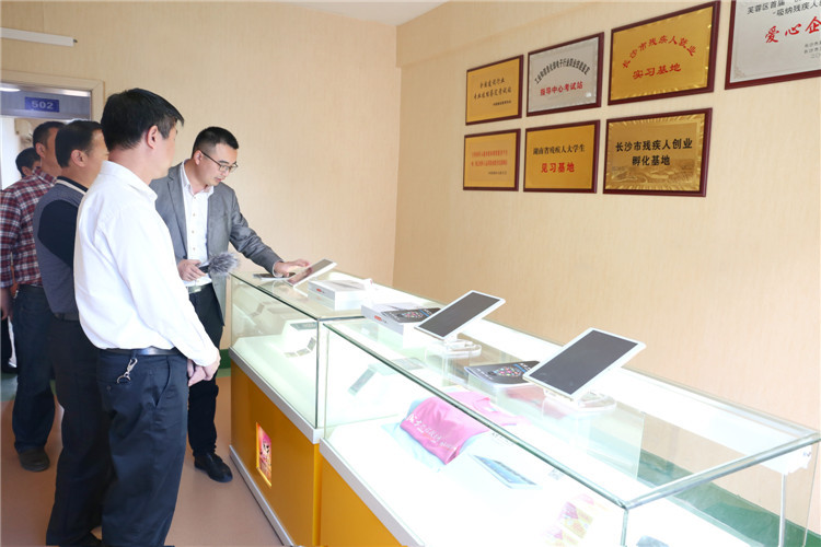 向科军理事长一行首先来到了成才培训学校位于长沙市天心区远航企业广场和芙蓉区万象新天企业公馆的两个残疾人就业、创业孵化基地参观考察。向理事长每到一处,都会详细了解具体情况,陈建华董事长一一解答。他介绍到,目前成才的这两个创业孵化基地总计有1100平米的办公面积,是长沙市残疾人创业孵化基地,同时也是芙蓉区、天心区等市区级残联的创业孵化基地。成才培训学校从硬件和软件下手,为每一位入训的残疾人“创客”提供项目孵化所需的基础设施和起步资金、人才、技术、政策及信息交流等帮助,并提供更多优质的客户解决方案。例如,为残疾人创业者提供免费的孵化场地扶持,并提供相关的安全、生活等后勤服务;充分整合各界资源,提供残疾人创业人才培养、就业、实习一条龙服务;提供项目和产品扶持,解决创业者创业压力过大、运营成本过高等实际性难题;提供创业孵化延伸服务,为项目孵化对象提供创业指导、心理辅导、远程教育、人才推荐、创业跟踪指导等一系列后续延伸服务;提供孵化基地配套服务,协助孵化对象进行项目开发、业务拓展等服务;开展法律、会计、审计、评估、专利、企业管理、创业扶持优惠政策等咨询服务等。目前,基地已成功帮助20多家、50多名残疾人在礼品贸易、非物质文化遗产工艺、网络科技、文化传播、旅游服务配套产品等不同领域中实现自主创业,同时也带动了长沙及其他市州数百名残疾人朋友的就业和创业。