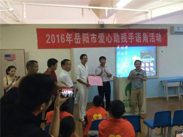 7月29日上午,顶着炎炎烈日,一群热心帮助搭建聋哑朋友与健全人信息沟通桥梁的志愿者欢聚在南湖广场“公益格子铺”岳阳市爱心助残志愿者第11号工作站,大家举办了全市首次“爱心助残手语角”活动。市残联理事长向科军、湖南日报社岳阳分社社长徐亚平、岳阳市爱心助残志愿者协会会长姚平,岳阳市特教学校校长吴志刚、优秀手语教师吴小平等40多名手语传播志愿者参加活动。著名影星周润发的替身演员文祥也专程赶到现场,与爱心助残手语爱好者们互动交流,展示其助残公益情怀。